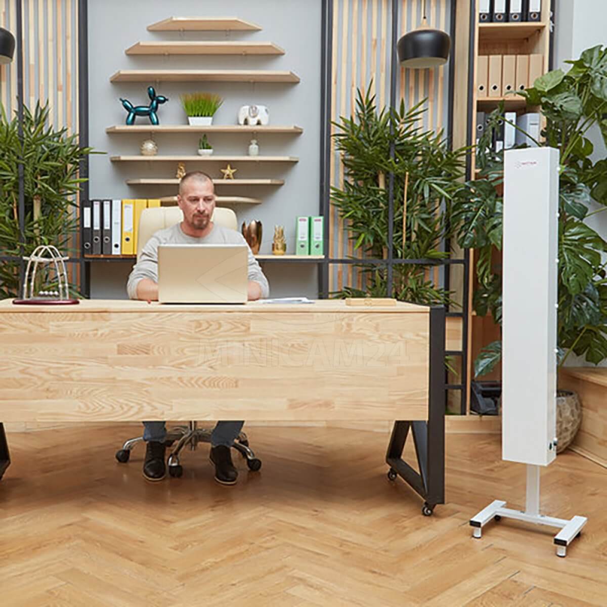 Уникальный по своим характеристикам прибор, с помощью которого обеззараживают воздух в помещениях различного назначения. Очистка производится с помощью двух ультрафиолетовых ламп, которые установлены внутри прибора. Прокачка воздуха через источники ультрафиолетового излучения выполняется с помощью встроенного вентилятора. Это повышает эффективность устройства и его обеззараживающие возможности. Все рабочие детали и узлы находятся в закрытом корпусе, поэтому рециркулятор может функционировать независимо от находящихся в помещении людей. Устанавливается на поверхность стены в вертикальном положении.