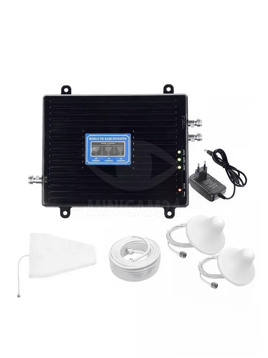 Усилитель сигнала связи Power Signal Double Black 900/1800/2100 MHz (для 2G, 3G, 4G) 70 dBi, кабель 15 м., комплект с двумя внутренними антеннами, комплект будет полезен для тех, кто испытывает трудности при пользовании мобильным интернетом на даче, дома или в офисе. Внешняя антенна, как правило, устанавливается за пределами помещения и на высоте нескольких метров. Благодаря этому она эффективно принимает даже слабый сигнал мобильного интернета, который плохо ловит своей миниатюрной антенной смартфон или 3G-модем ноутбука. После усиления сотового сигнала он подается на внутреннюю антенну, которая переизлучает мощный сигнал на дачный участок или квартиру, в результате на площади до 80 м² стабильно принимается мобильный интернет. Внешняя антенна может быть расположена на расстоянии до 15 от усилителя, кабель именно такой длины включен в комплект поставки.